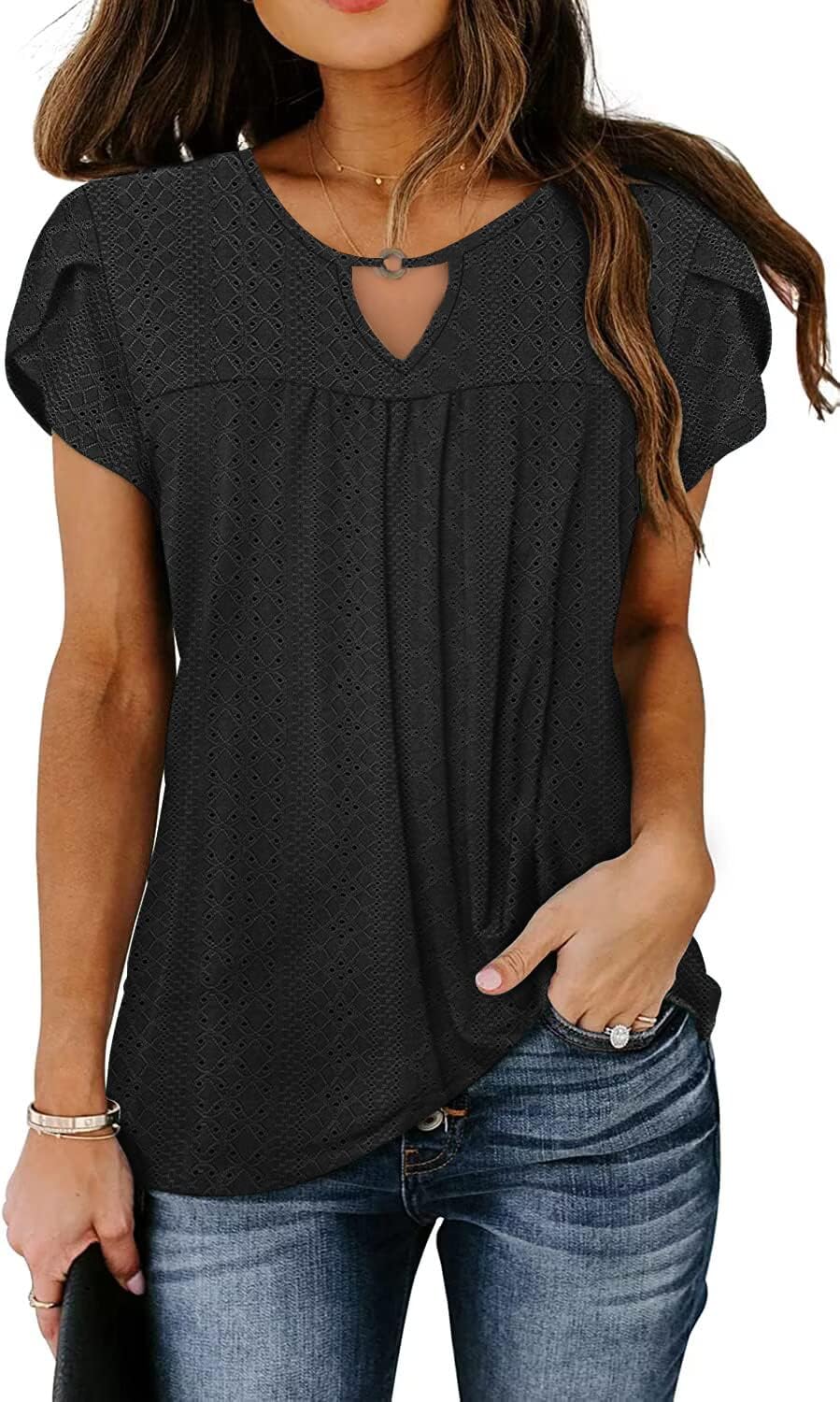 • Feature: Classic crew neck,cute key hole at the neck,fashion hollow out design, lovely petal sleeves, front pleated loose casual tunics that so flattering to hide the belly better