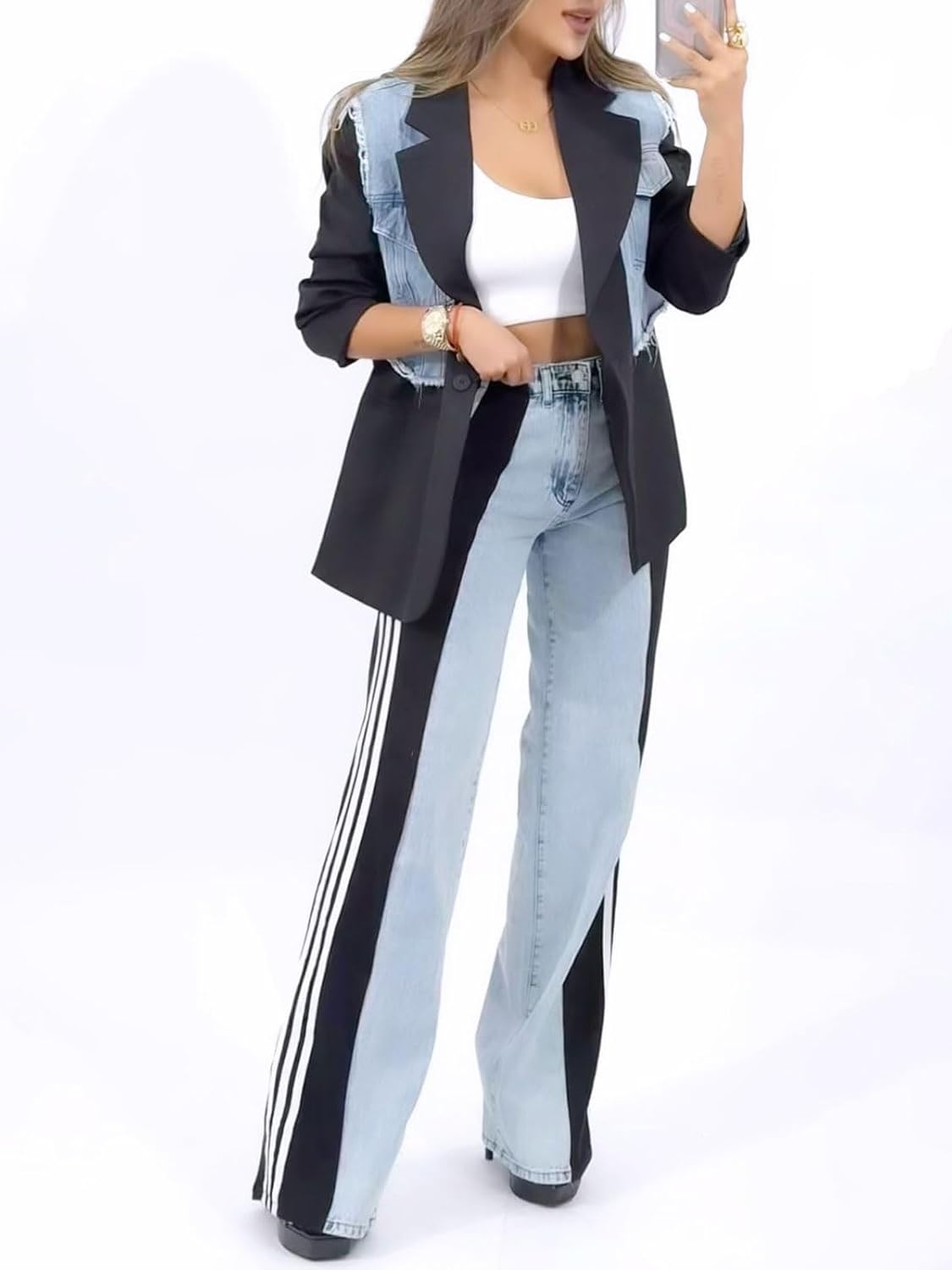 Women’s Jeans with Patchwork Stripes High Waist Loose Denim Color Block Jean Straight Wide Leg Pants